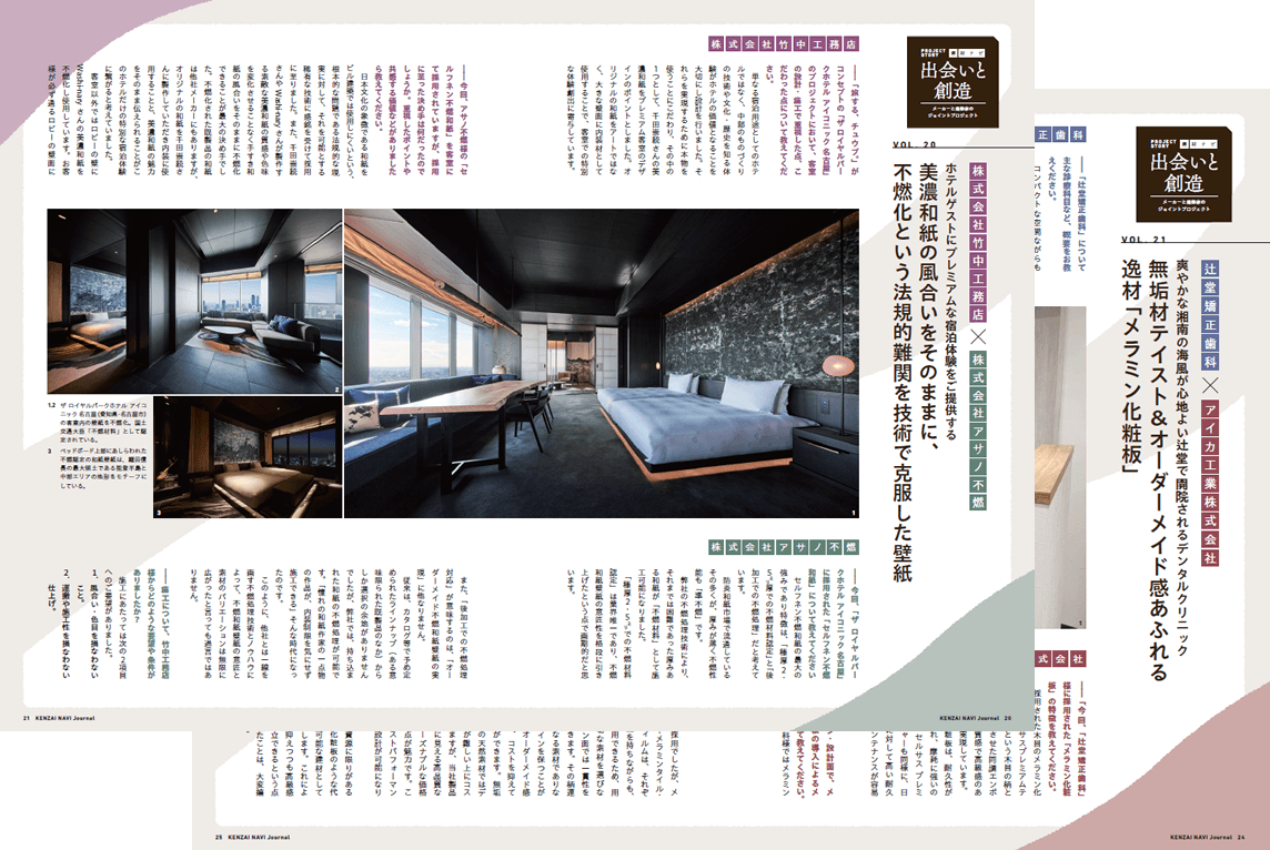 プロジェクトストーリー1つ目は、スーパーゼネコンの竹中工務店が登場。名古屋のホテルの客室内に、内装材として美濃和紙を使用するために必要な不燃化実現までのストーリーを紹介。不燃専門メーカーで有名なアサノ不燃との共創プロジェクトです。