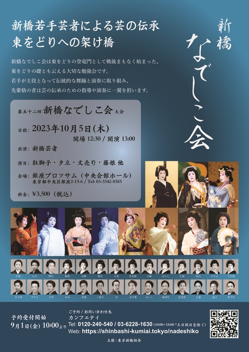 東京新橋組合主催、『第五十二回 新橋なでしこ会』が2023年10月5日 (木)に銀座ブロッサム(中央会館ホール)(東京都中央区銀座2-15-6)にて開催されます。チケットはカンフェティ(運営:ロングランプランニング株式会社、東京都新宿区、代表取締役:榑松 大剛)にて9月1日(金)10:00より発売開始です。