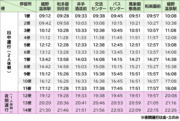 ※運行期間中の金曜日と土曜日は日中(11便)に加えて夜間便(3便)を運行