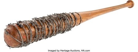 「ルシール」として知られるこのバットは、ニーガン(ジェフリー・ディーン・モーガン)の凶暴さを象徴する武器として、『ウォーキング・デッド』シーズン6での初登場からシーズン10まで使用されました。木製バットに有刺鉄線を巻き付けたプロップで、汚れや血痕を再現した加工が施され、使い込まれた質感が表現されています。