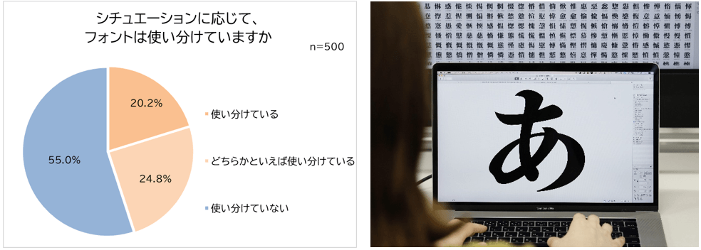 各ツールにおいてデフォルトのフォントから変えている人がいることがわかりましたが、プレゼン資料、謝罪文、催し事のお知らせなど、さまざまなシチュエーションに応じてフォントを使い分けているのかも調査しました。結果、「使い分けている(20.2%)」、「どちらかといえば使い分けている(24.8%)」を合わせて45.0%と、半数近くの人が状況に応じてフォントを使い分けている実態が明らかに。男女別では大きな差はありませんでしたが、年代別でみると、フォントを使い分けている人は20代で47.2%、30代で51.2%、40代で38.4%、50代で43.2%でした。比較的若年層の方が、フォントを使い分けている人が多い傾向にありました。
