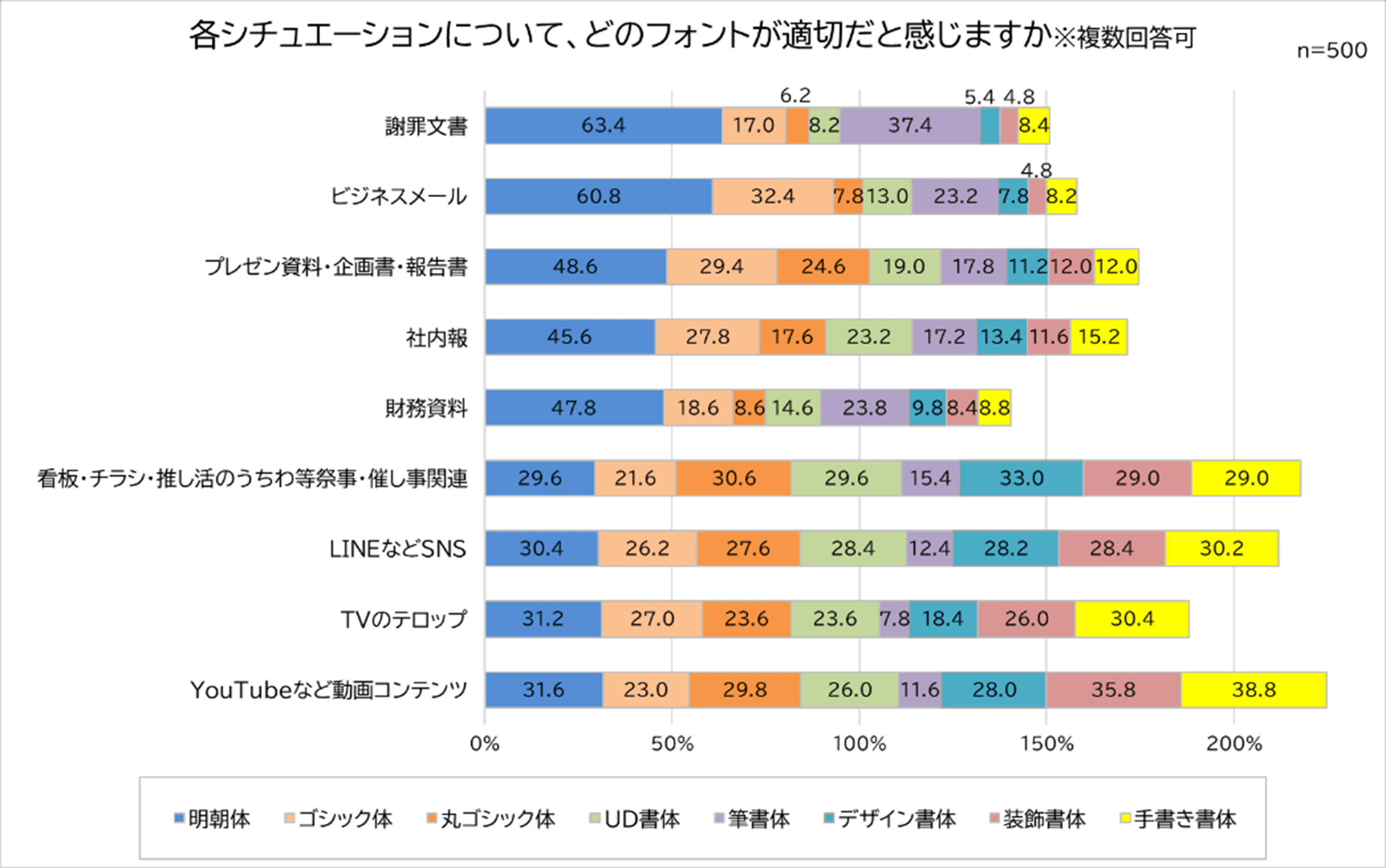 適切に使えている?働く男女に聞いたフォント事情! 約3人に1人、文書とフォントに違和感を覚えた経験あり! 「誠実さが伝わらない」謝罪で適切だと思うフォント1位「明朝体」 半数近くがフォントを使い分け!エピソード10選。好きなフォント1位「明朝体」2位「ゴシック体」3位「手書き書体」