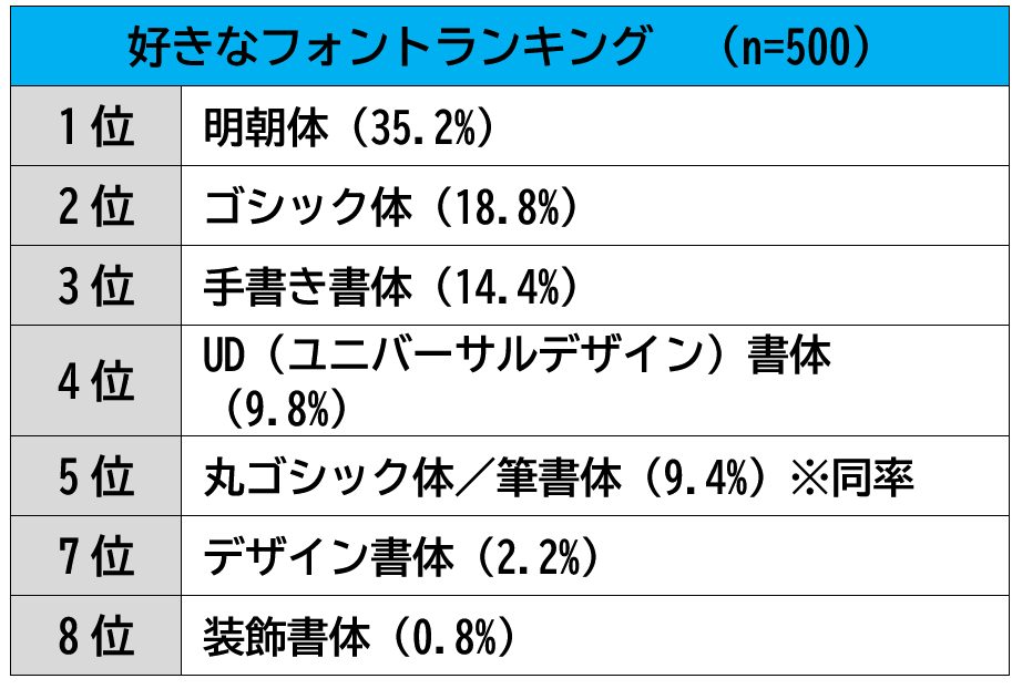 4.好きなフォントランキング1位「明朝体」2位「ゴシック体」3位「手書き書体」男女・年代別も!