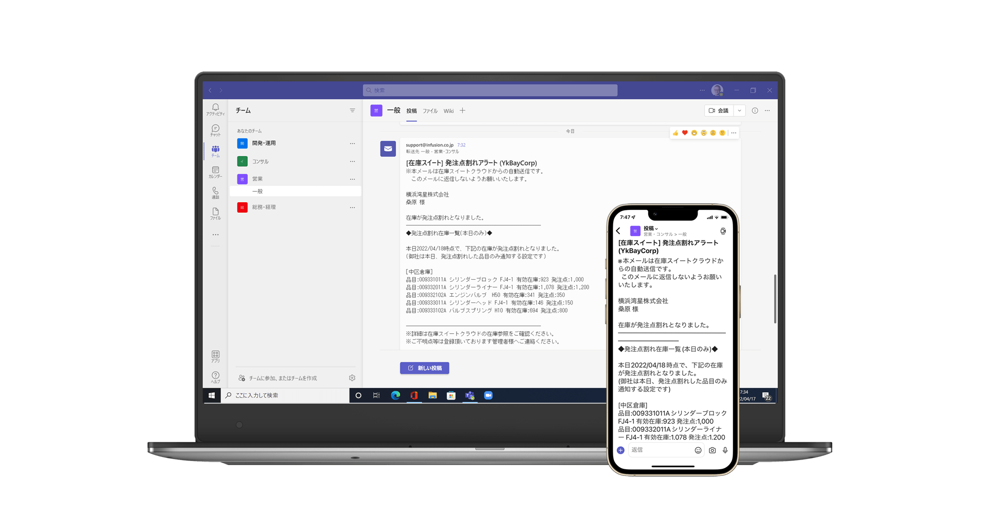 クラウド在庫管理システム、 発注点割れリストをメールやTeamsで通知が可能に 当日割り込み限定で、重複発注のリスクを軽減