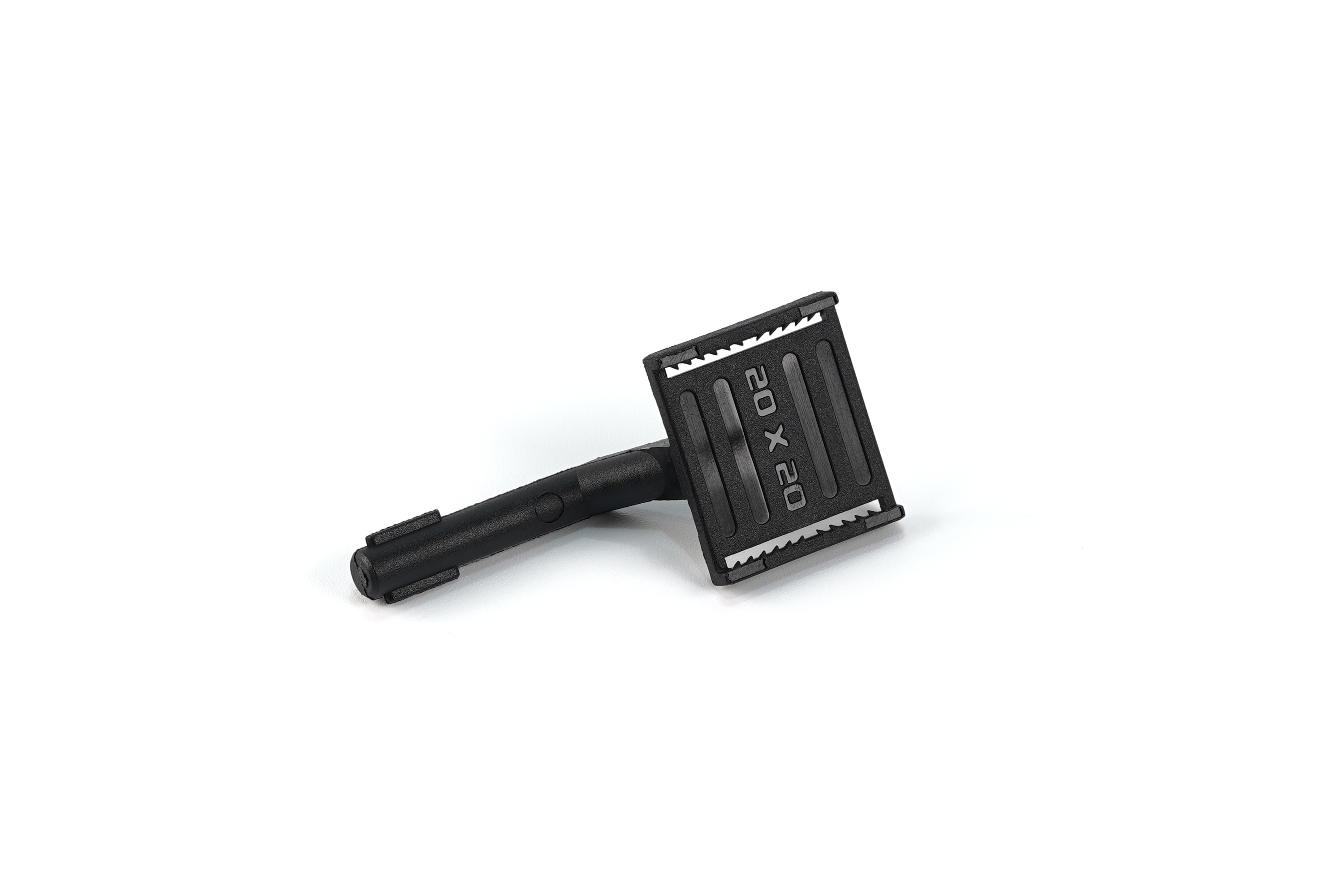 - 左右の刃と取付け面の凹凸が、スポンジヤスリを5,000ストローク/毎秒の激しいストロークでもずれないように固定。特殊形状、日本・台湾・ドイツにて実用新案取得済。