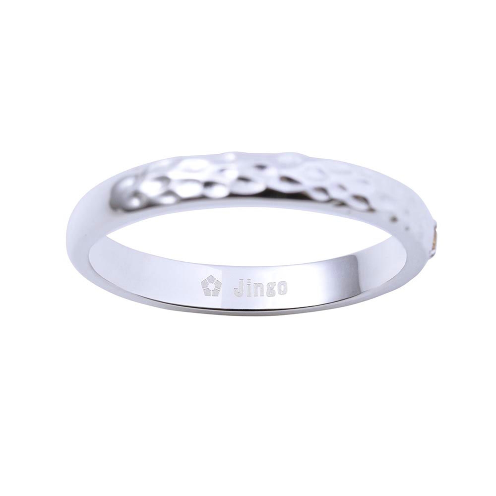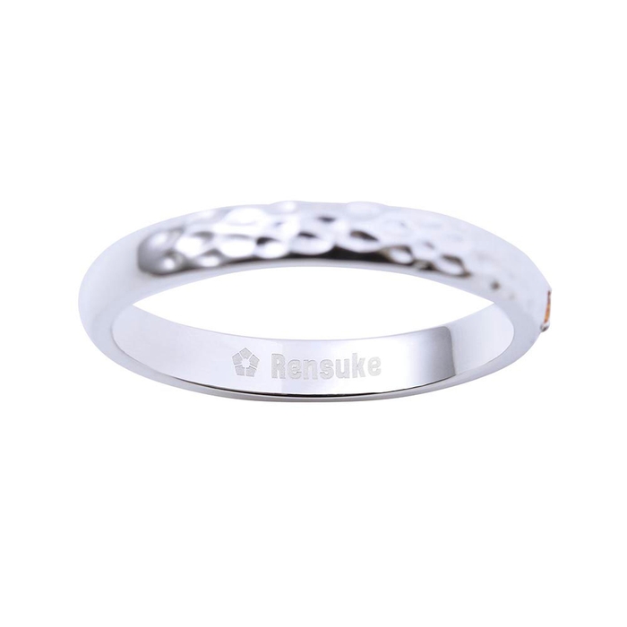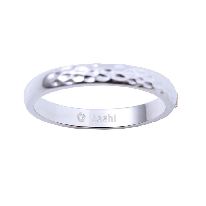 甲丸リングに槌目加工を施し、イメージカラーストーンをセット。作品の世界観をデザインに取り込みました。