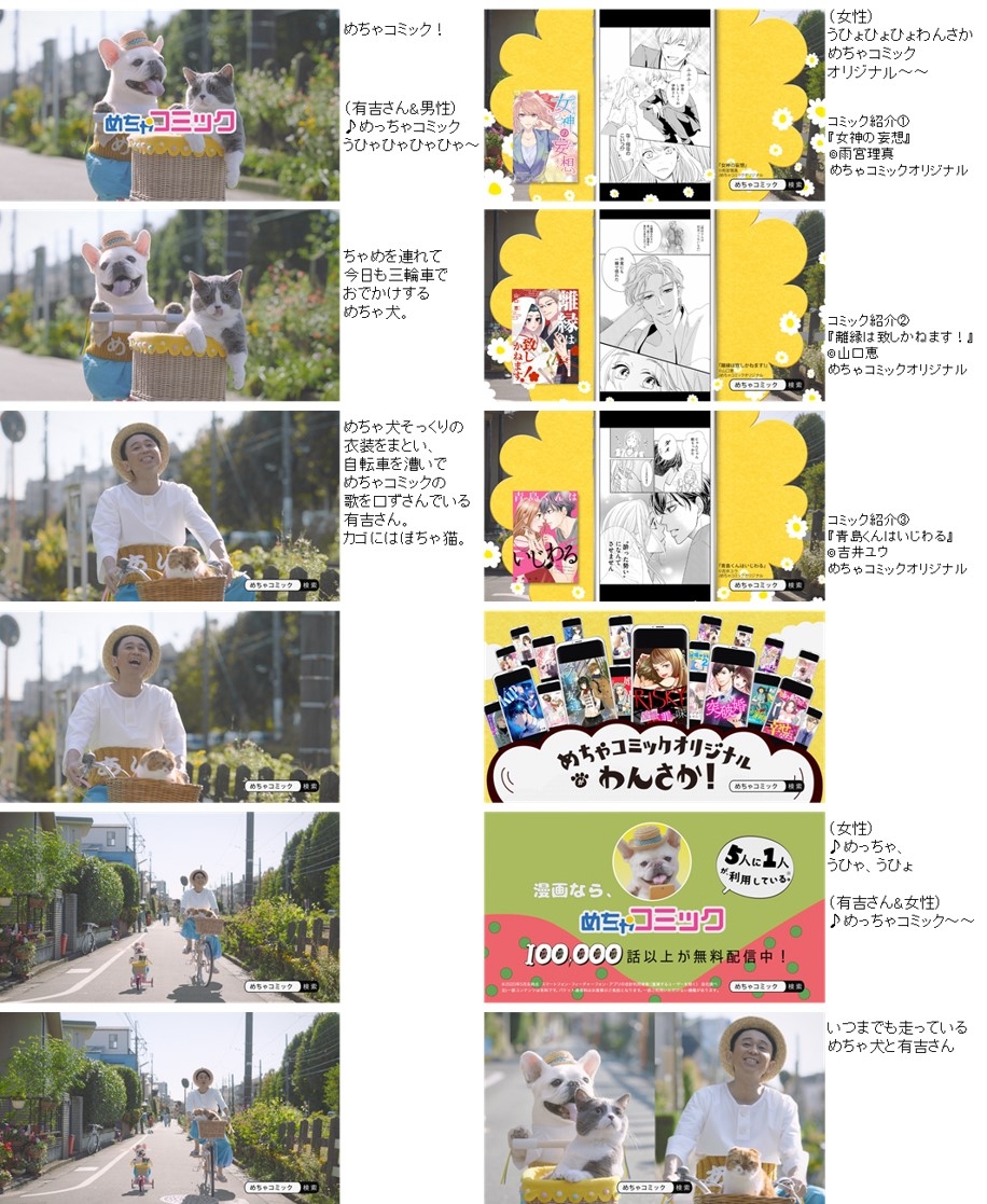 「有吉さんと遭遇篇」では、皆さまお馴染みのめちゃ犬との出会いを描いた作品となっております。また有吉さんは、“ありょ”と書かれた腹巻をし、めちゃ犬そっくりの衣装で登場。自転車をのんびり漕ぎながら、めちゃコミックの歌を口ずさむ有吉さんの姿が印象的なCMにしました。