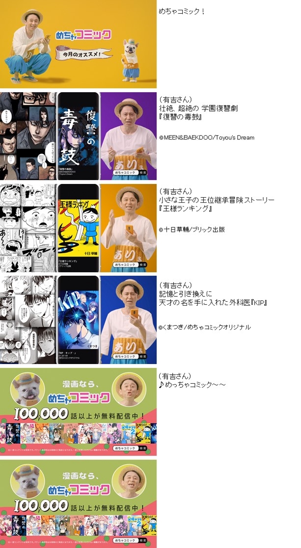 株式会社アムタス(東京都渋谷区 代表取締役社長 山下正樹)の提供する電子コミック配信サービス「めちゃコミック(めちゃコミ)」は、有吉弘行さんを起用した新TVCM 「有吉さんと遭遇篇」「今月のオススメ 有吉さん篇」を2020年12月25日(金)より放送開始いたします。