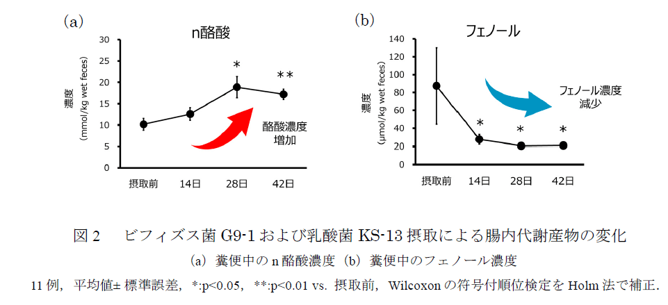 【研究成果2:ビフィズス菌G9-1および乳酸菌 KS-13は腸内のn酪酸を増加、フェノールを減少させ、便臭を軽減する】