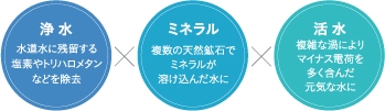 残留物質が除去され天然鉱石のミネラルが溶け込んだ水は、分子が小さくなり、遠赤外線効果も加わります。さらに活水器により水の性質が変わり、肌あたりがやわらかいまろやかな水質に。湯上りのぽかぽか感もお楽しみいただけます。