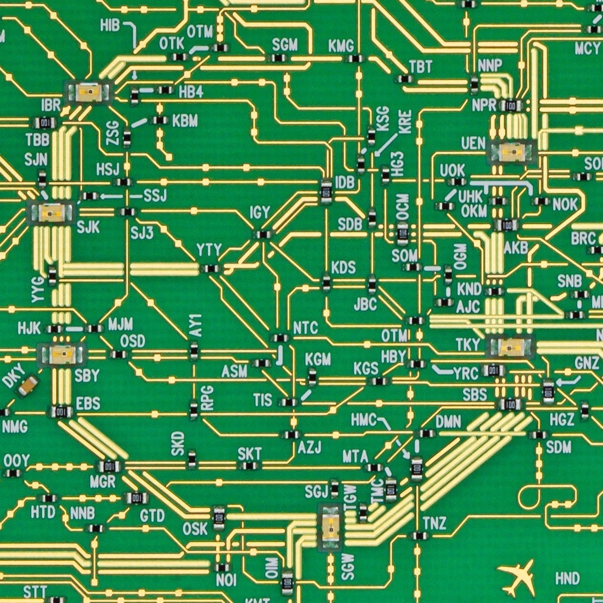 乗り換え駅に電子部品を実装(はんだ付け)しており、主要6駅に2mmの赤色LED、その他主要駅2駅に2mmの抵抗器、乗降客の多い駅25駅に1.6mmの抵抗器、その他乗換駅166駅に1mmの電子部品を実装しております。鉄道駅の名称は白シルク3文字で表現しています(例 TKY 東京)。