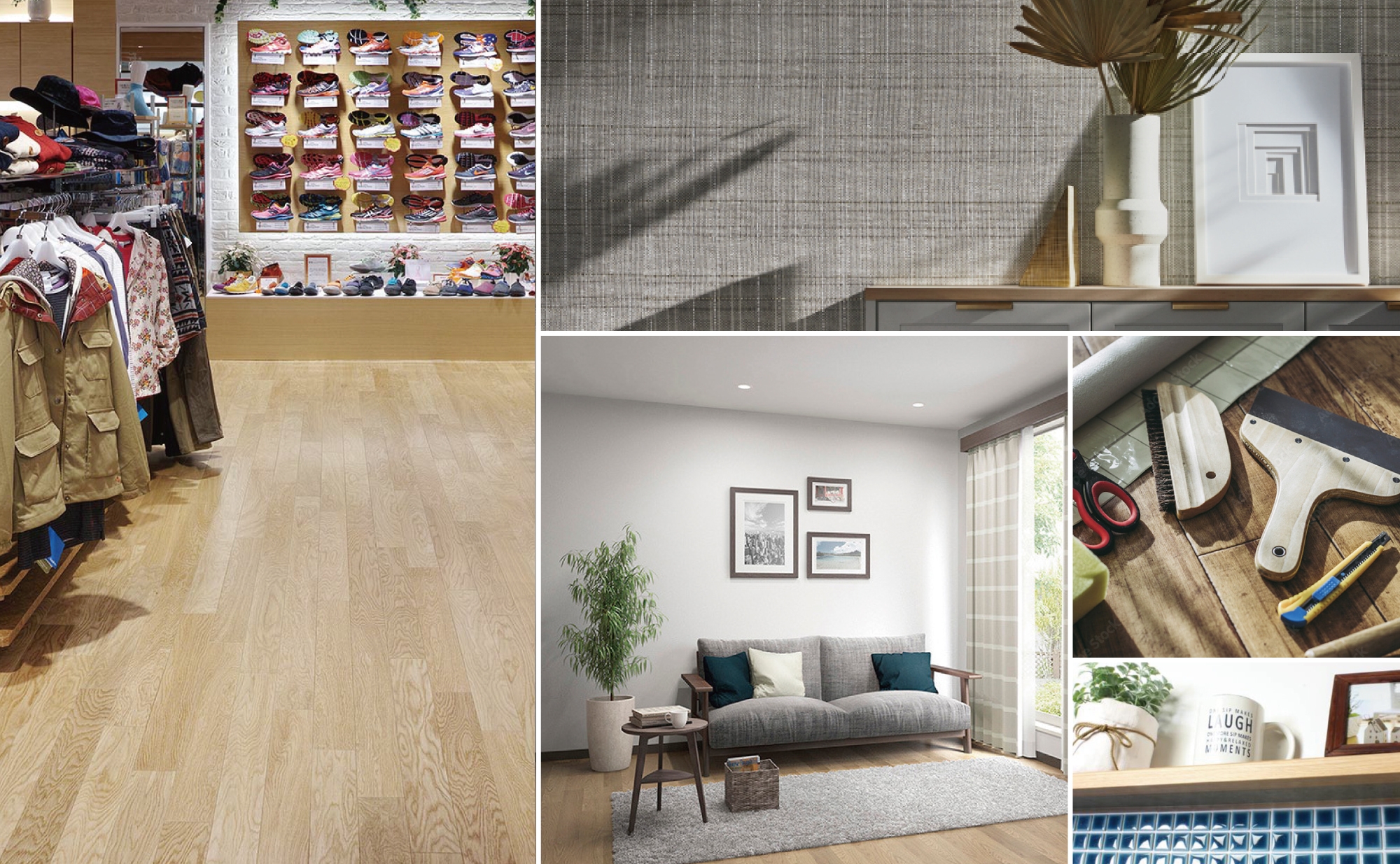 「ドンピシャマート」では、カーペット、壁紙、化粧フィルム、塩ビ床材、建築金物などの内装資材を多数ラインアップ。