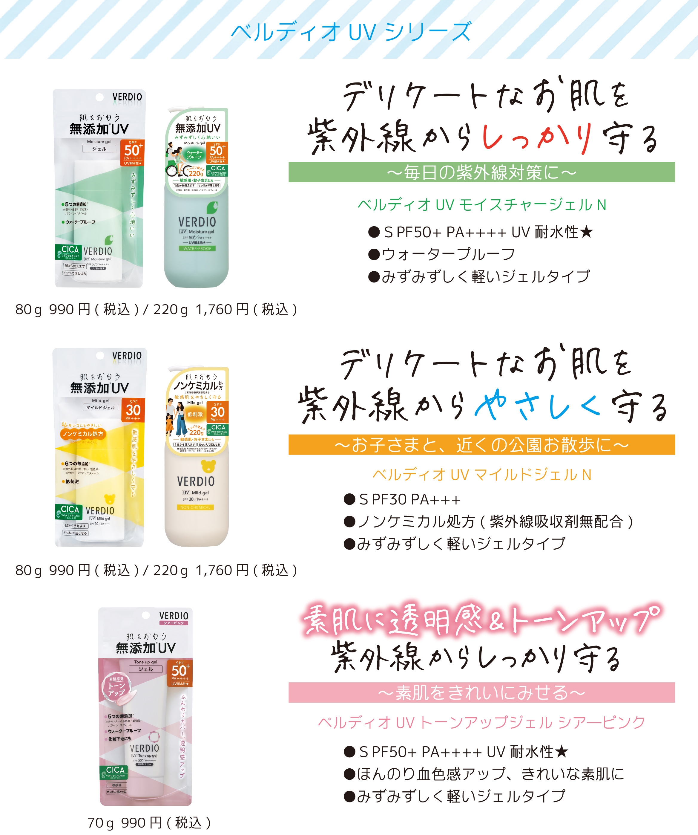 「ベルディオUV」は、“肌をおもう”コンセプトのもと、無添加(*2)・低刺激にこだわった日やけ止めシリーズです。