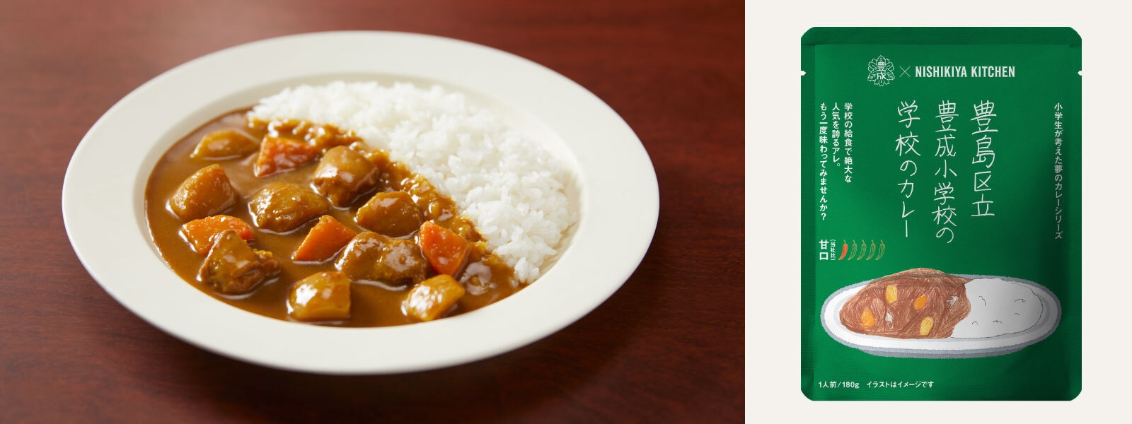 NISHIKIYA KITCHEN(ニシキヤキッチン)(株式会社にしき食品 本社:宮城県岩沼市、代表取締役:菊池 洋)は、2024年2月1日(木)に、東京都豊島区立豊成小学校の児童と一緒に企画開発した「豊島区立豊成小学校の学校のカレー」と「アーモンドミルクバナナカレー」を、ニシキヤキッチン実店舗と公式オンラインショップ、無印良品(株式会社良品計画 本社:東京都豊島区、代表取締役社長:堂前 宣夫)の一部店舗にて、数量限定で発売いたします。ニシキヤキッチンでは2023年6月から「学校のカレープロジェクト」と題し、小学生と一緒にレトルトカレーの味わいやパッケージデザイン等を検討する授業を全6回実施しました。レトルトカレーのパッケージには「レトルト対応紙製スタンディングパウチ」を採用し、環境に配慮した商品づくりについても一緒に考えました。このプロジェクトを通して、子どもたちの創造力を育み、商品づくりへの楽しさや喜びを知ることで、一生ものの体験をしながら食育につなげることが最大の目的です。