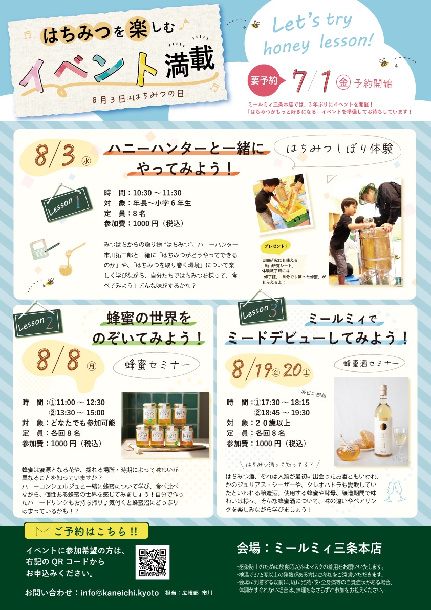 株式会社金市商店(本社:京都市中京区三条通富小路西入中之町 21)は、8月3日の「はちみつの日」を 記念して、「蜂蜜専門店ミールミィ」などの直営店舗にて8月に様々なイベントを企画、開催いたします。