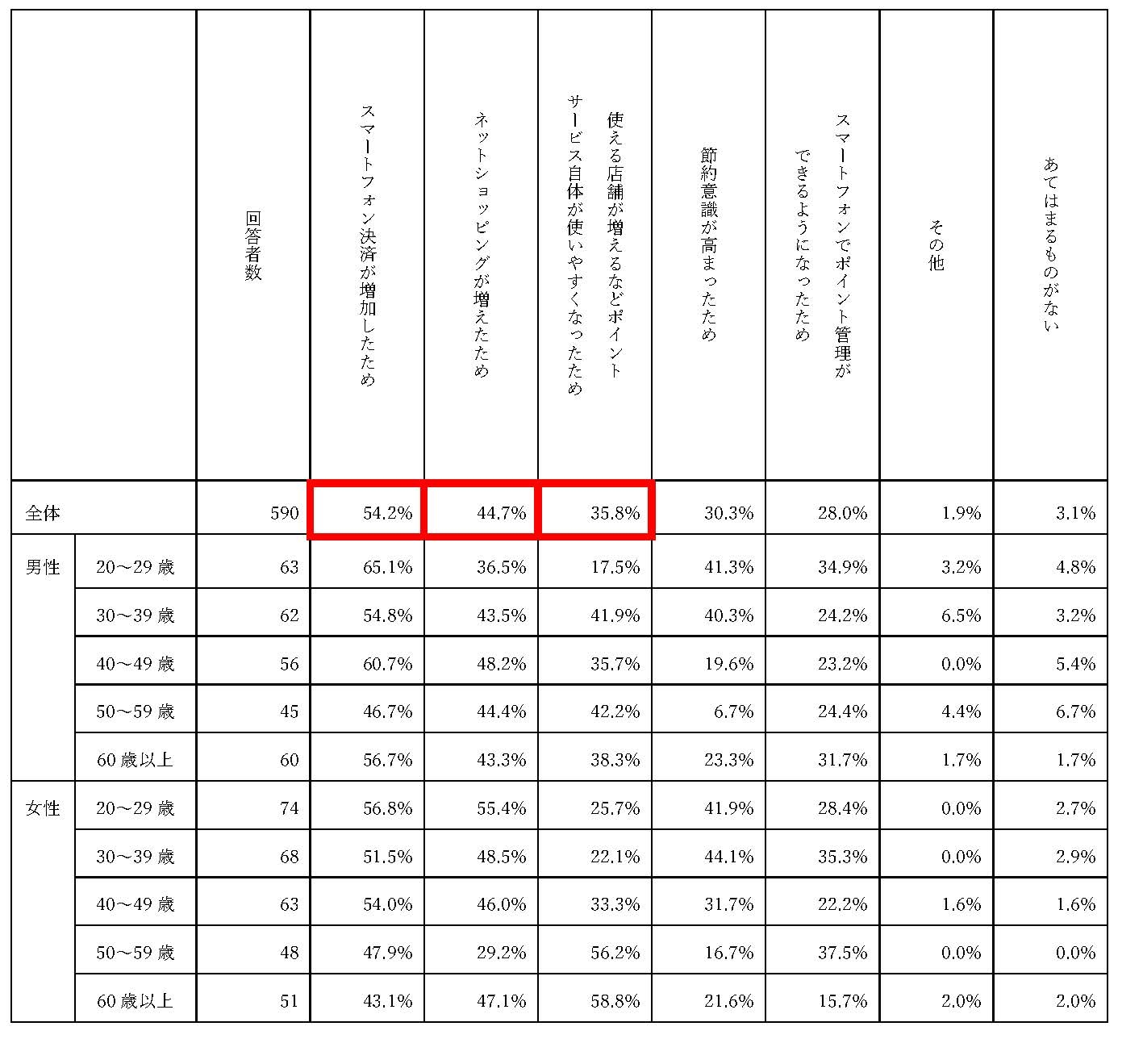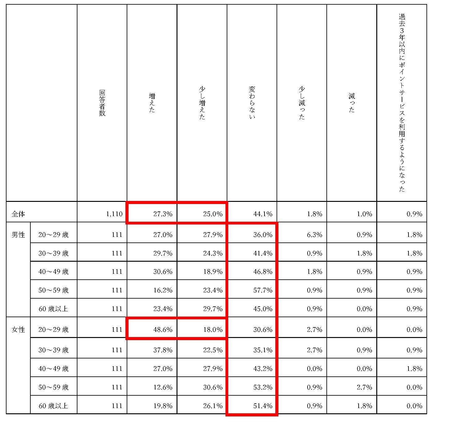 ・ポイントサービスの利用が「増えた(27.3%)」「少し増えた(25.0%)」「過去3年以内にポイントサービスを利用するようになった(0.9%)」の合計が53.2%と過半になっている一方、「少し減った(1.8%)」「減った(1.0%)」の合計がわずか2.8%にとどまっていることから、過去3年程度で顕著に普及していることが窺える。特に、本調査では、20代女性の「増えた」が48.6%、「少し増えた」が18.0%となっており、若い女性層の意識の変化が表れていた。