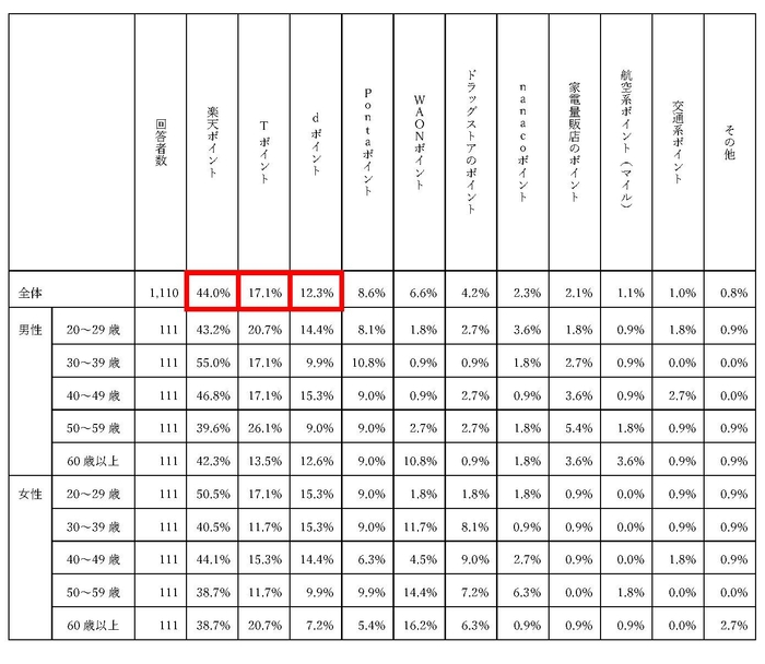 ・これに次ぐ第2位はTポイント(55.5%)で、首位の楽天ポイント同様、年齢・性別を問わず、幅広い層で利用されている結果。なお、 50代男性では楽天ポイントを上回り最多となっている。