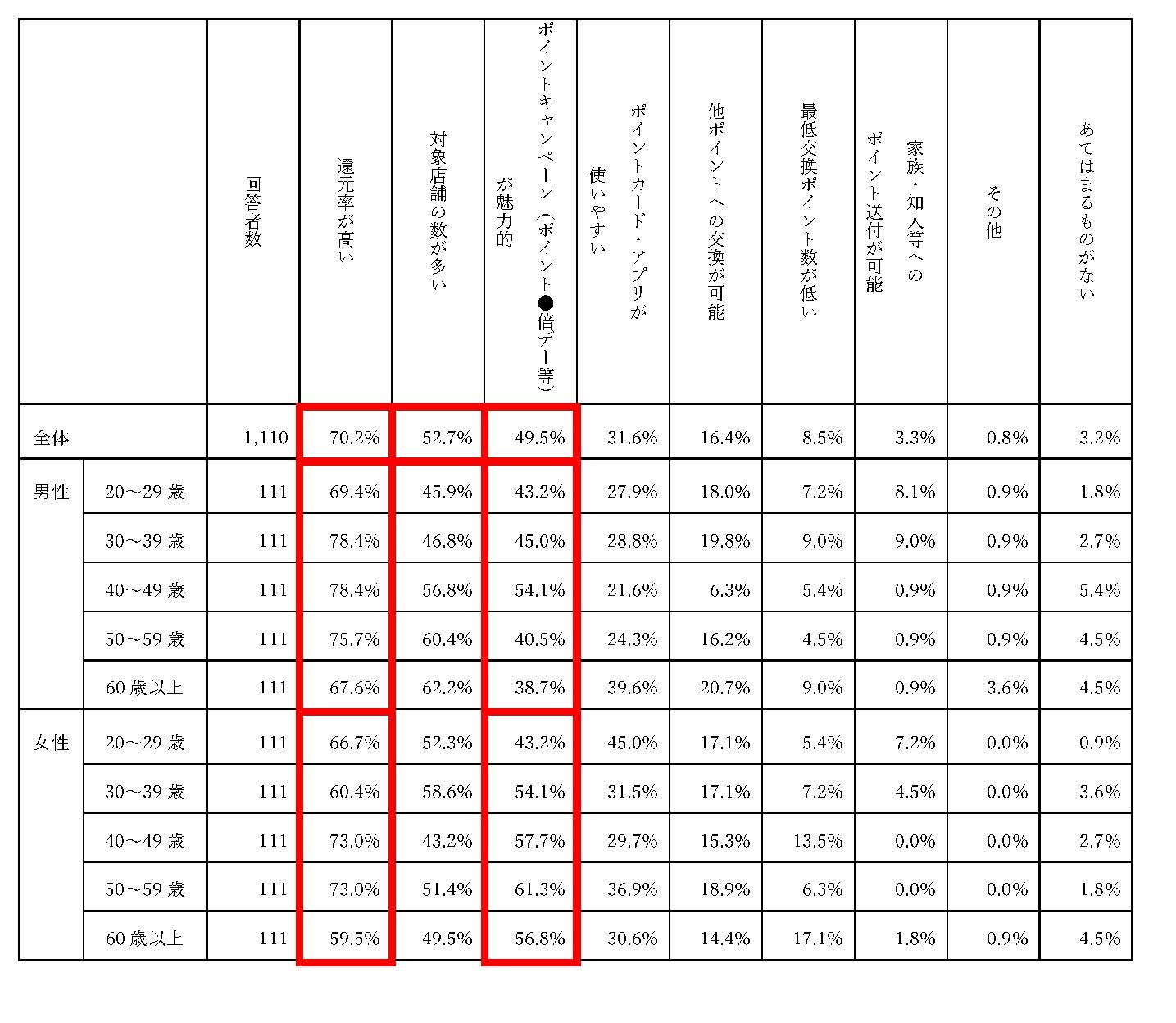 ・男女別で比較した場合、「還元率が高い」を選んだ割合は、男性73.9%、女性66.5%であったのに対し、「ポイントキャンペーン(ポイント●倍デー等)が魅力的」を選んだ割合は男性44.3%、女性54.6%となり、男性がシンプルに還元率を求める一方、女性はキャンペーンを好む傾向が表れた。