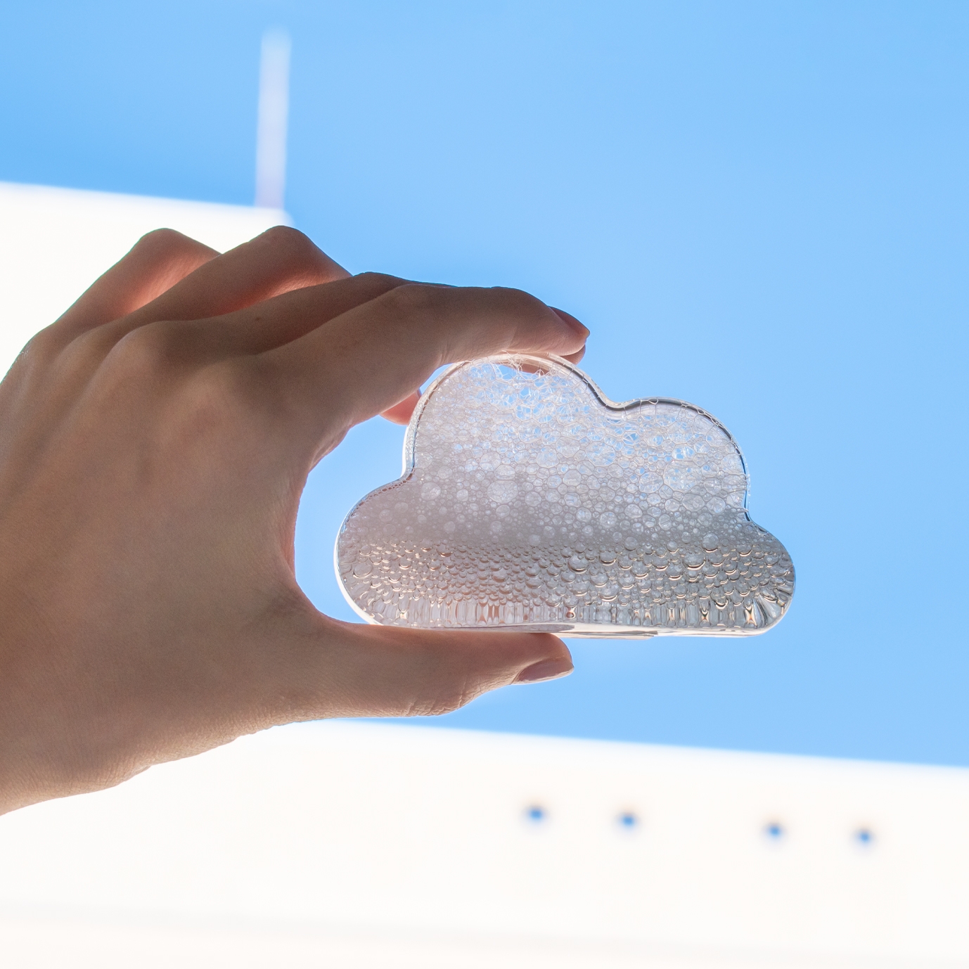 そのままでもかわいい雲形のガラスオブジェが、振ることで中のシャボン水が泡立ち、まるで雲のように変化します。