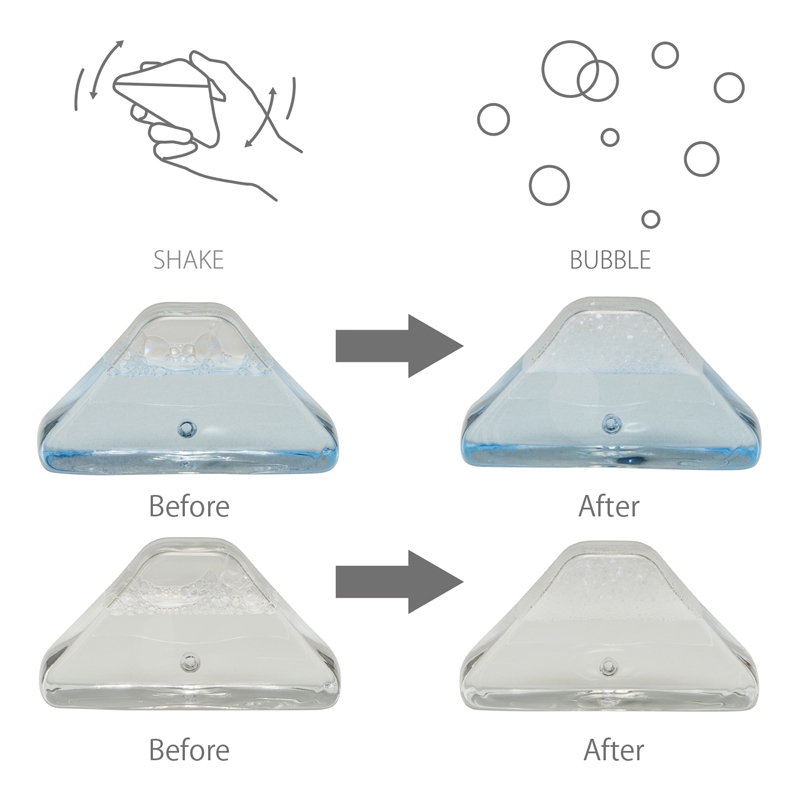 商品を手に持ちゆっくりと振ると、ガラス内部のシャボン水でさまざまな泡が生じます。泡の様子により振る前とは全く違うガラスオブジェに変わります。泡は長い時間(Hour)をかけて、ゆっくりとはじけていき、元の様子に戻っていきます。ゆったりとした時間のなかで、移り行く泡の様子をお楽しみ下さい。