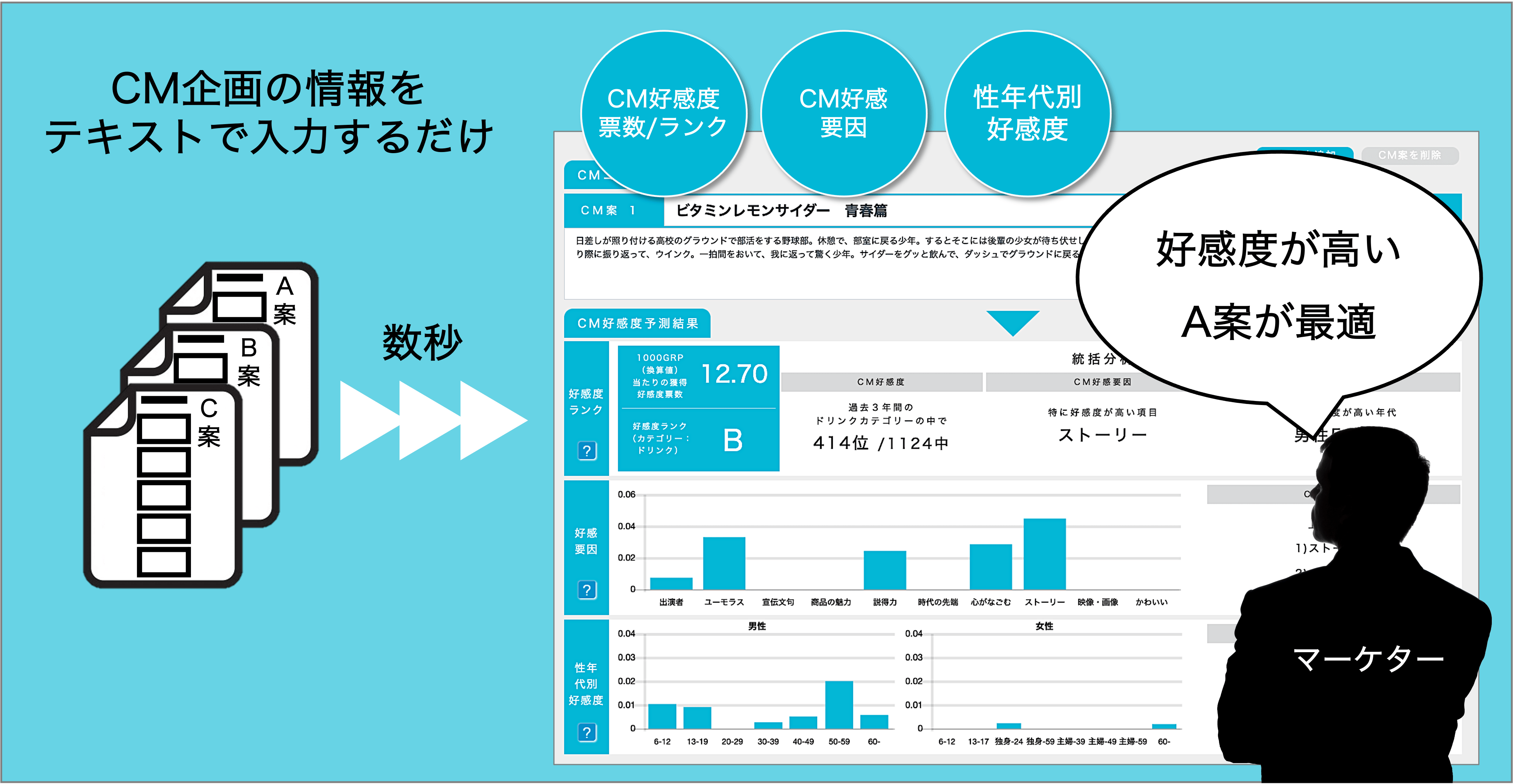 CM好感度予測AIは、CM総合研究所が保有するテレビCMデータとCM好感度データをインプットし構築されたシステムです。絵コンテや字コンテなどのCM企画の情報をテキスト入力するだけで、①CM好感度票数/ランク②好感要因③性年代別好感度の予測結果を直感的なダッシュボードで表示。