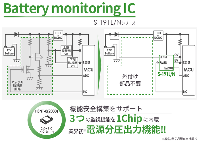 本日発売したバッテリーモニタリングIC「S-191L/Nシリーズ」は、安全性確保に求められるECUの機能の中で電圧を監視する為のICです。