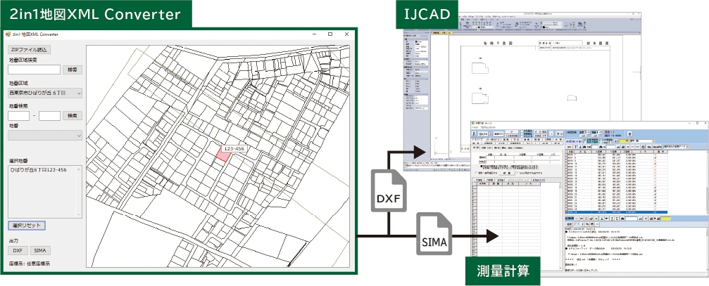 「地図データコンバーター」は、XMLデータをDXF形式やSIMA形式に変換が可能です。これにより、G空間情報センターより無償提供される、全国の法務省登記所備付地図データを2in1で活用できます。