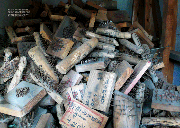 錆びたハサミ[縁結び]、釘を打った男根[浮気防止]、女性の髪の毛[病気平癒]、花嫁人形[幼年で亡くなった息子へ]、御神木に打ち付けた鎌[子宝祈願]、朱塗りの猿[安産祈願]、ハシゴ[おねしょ封じ]、紙で作ったスマホ[燃やしてあの世へ]……