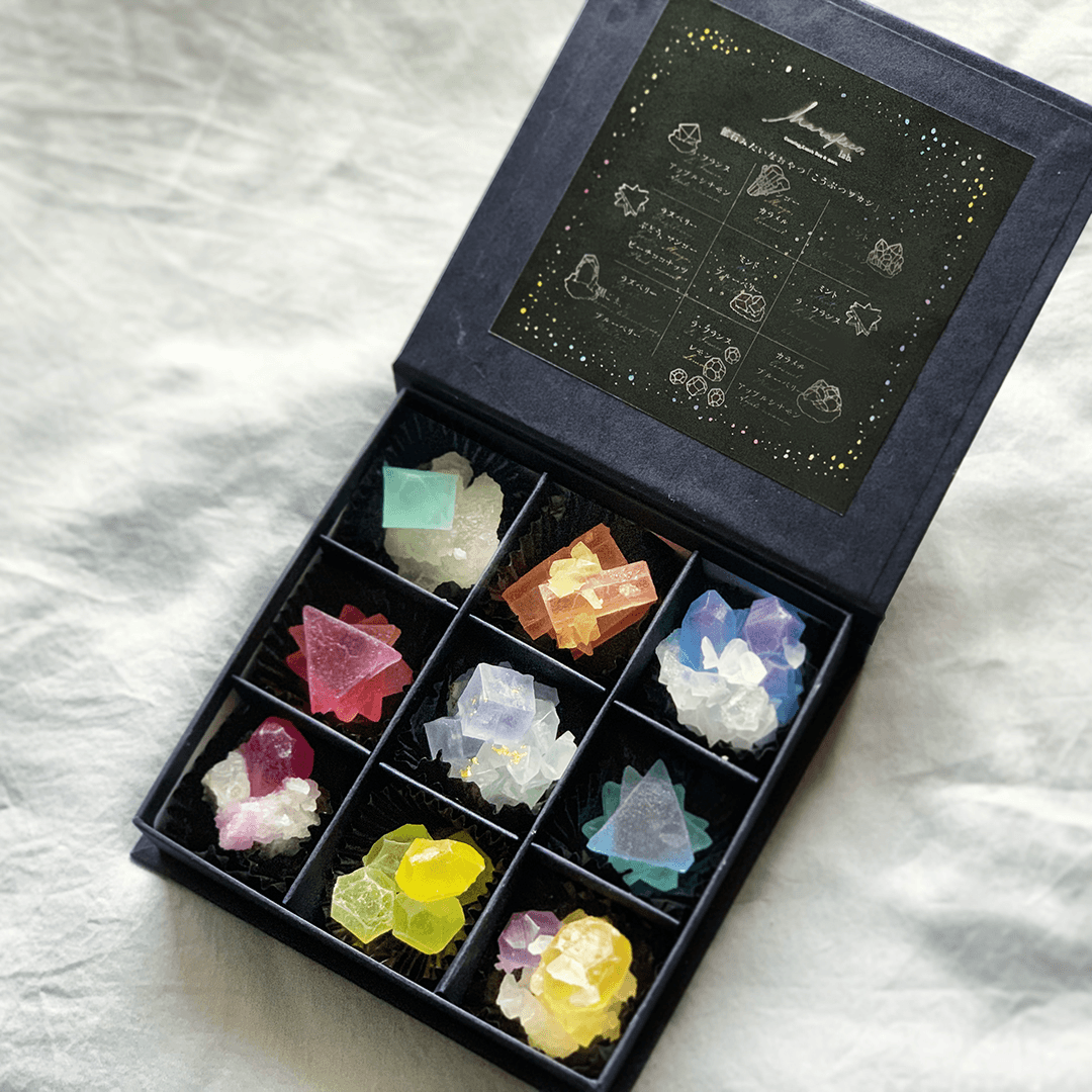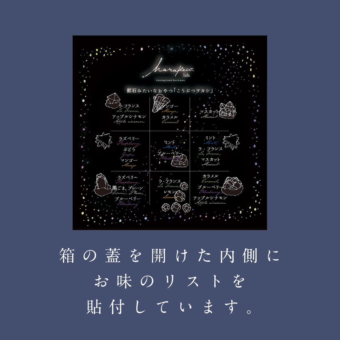銀河のこうぶつヲカシは夏の夜空をイメージした物語性の強い作品です。夏らしい爽やかなお色味の中に、暗闇に光星々を散りばめました。そのひとつ一つが星の様であったり蛍石の様であったり幻想的な雰囲気を纏っている特別な箱をご用意いたします。