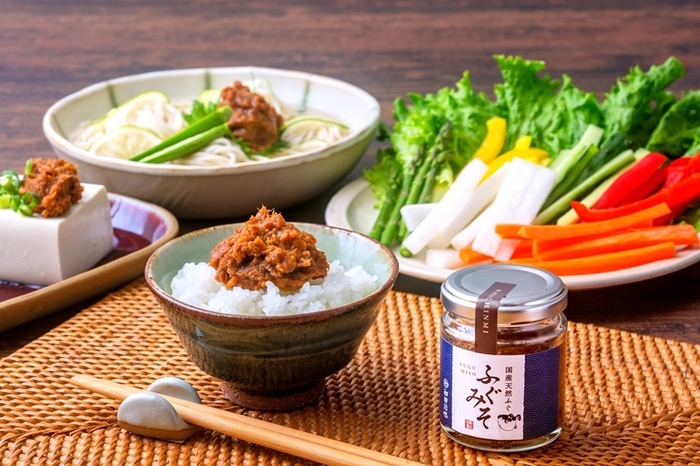 国産の梅を使用し、ふっくらとした国産の天然ふぐの身、井上醤油店のみそをはじめとした調味料を合わせました。梅の酸味と味噌の甘みが上品なふぐの旨味を引き立てる一品、野菜や麺にも良く合う「おかず味噌」です。