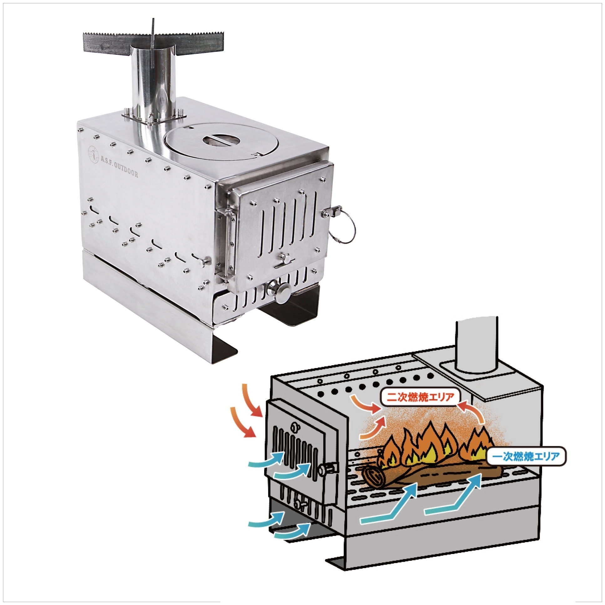 3方向から新鮮な空気を取り入れ、二次燃焼を誘発しやすい構造で高火力を実現。一体型構造のため隙間から熱や煙が漏れにくく、火起こしがより素早く終わります。前扉下部には灰トレイがあり、不要な灰の除去もスピーディに完了。撤収作業もスムーズに終わります。