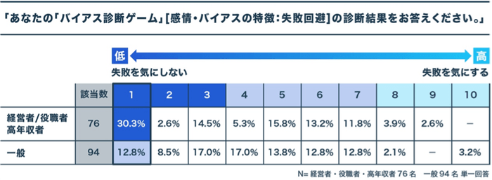 今回調査では、「バイアスに対してネガティブなイメージをもっている人」が半数以上(55.9%)と判明。その後「バイアス診断ゲーム」を受検後の事後調査では「バイアスに対してネガティブなイメージをもっている人」が半数以下の40.5%まで減少しました。一般的にあまりよくないイメージがある『バイアス』について理解が深まったことで活用できそうという声もあがり、ネガティブなイメージに変化があったようです。さらに会社での責任も大きい経営者・役職者は一般層より「失敗を気にしない」傾向も判明いたしました。