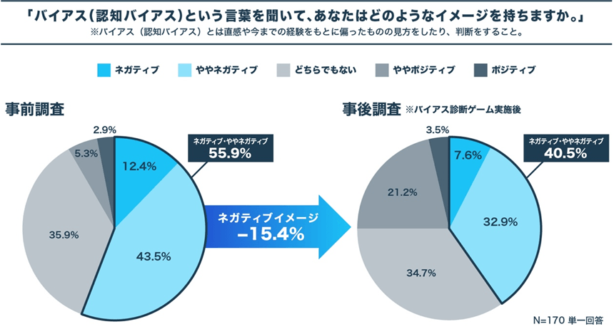 今回の結果から、一般的にあまりよくないイメージがある『バイアス』について理解が深まったことで、実際活用できそうという声もあがり、ネガティブなイメージからの変容が見られました。『バイアス』は決してネガティブなだけではなく、自分がどのような『バイアス』を持っているか知り、意識をすることでビジネスにおける場面に活用することが可能です。