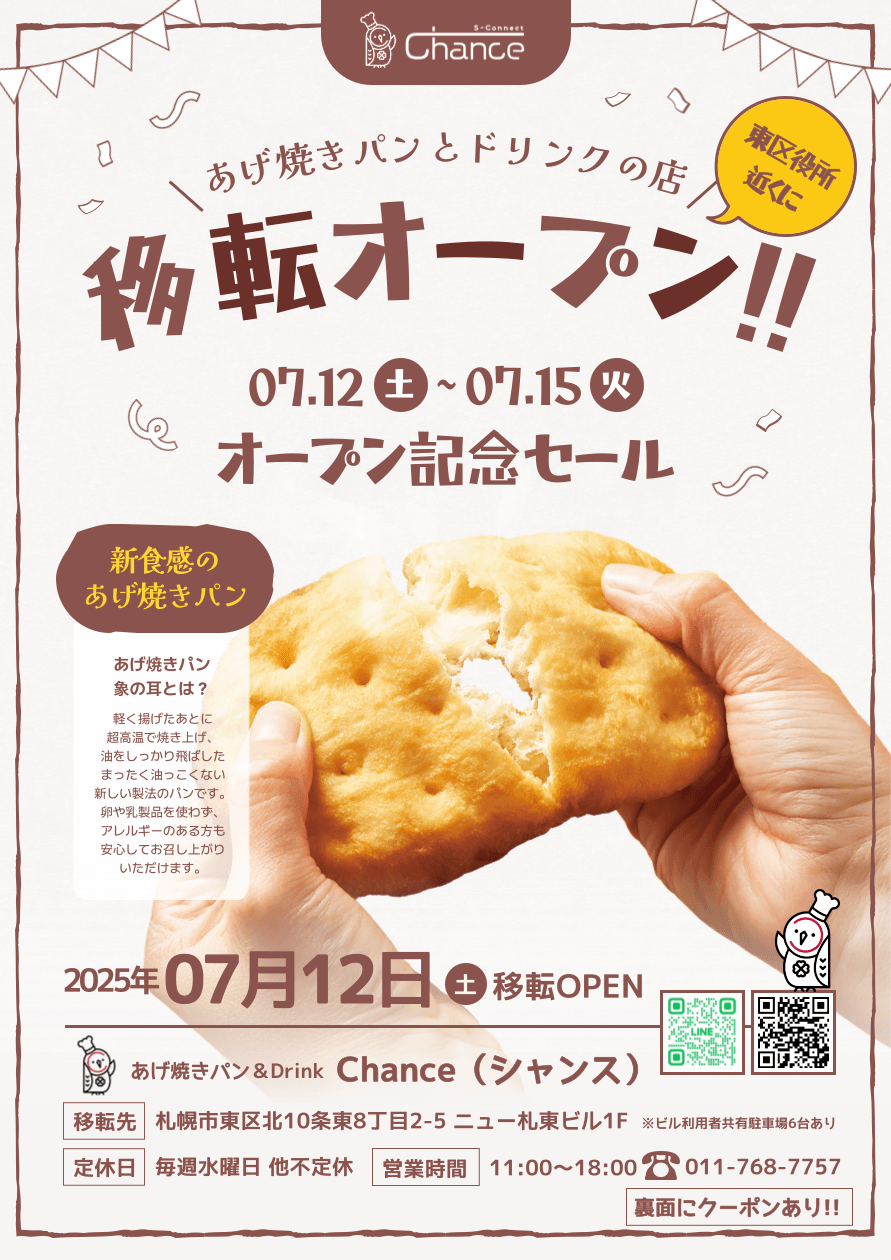 まったく油っこくない新しい製法が特徴のあげ焼きパン「象の耳」特約店『Chance』(読み:シャンス、所在地:北海道札幌市東区、代表:佐々木 博道)は、地域の皆さまにご愛顧いただいてきた店舗を移転し、札幌市・東区役所近くへ2025年7月12日(土)に移転オープンいたします。