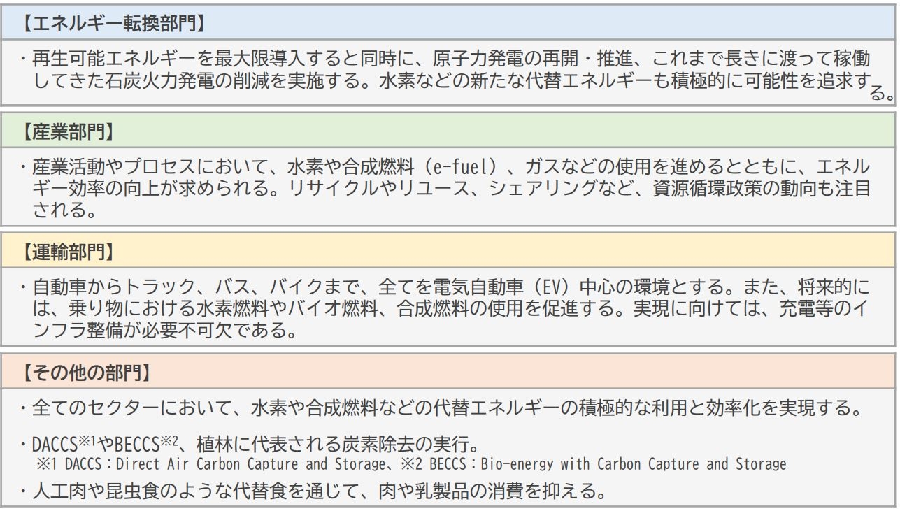 2022年現在、日本は上記3つ全てにおいて、世界ランキング3位以内に入っており、実は取り組みとしてはトップレベルである。しかし、日本はCO2排出量世界ランキング5位(注7)であり、まずは2030年の目標達成に向けて、さらに取り組みを加速しなければならない。次頁では、目標達成をするために、具体的に何をするべきなのか、業界部門別の行動シナリオについて言及する。