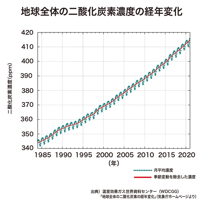 参照:地球全体のCO₂の経年変化/気象庁 (2022年10月27日)https://www.data.jma.go.jp/ghg/kanshi/ghgp/co2_trend.html