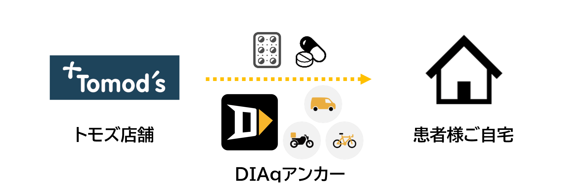 シェアリングエコノミー配送アプリ「DIAq(ダイヤク)」 調剤併設型ドラッグストア「トモズ」を展開する 株式会社トモズと連携 2022年2月1日に開始する同社の処方薬配送の実証実験で 当日配送サービスを提供