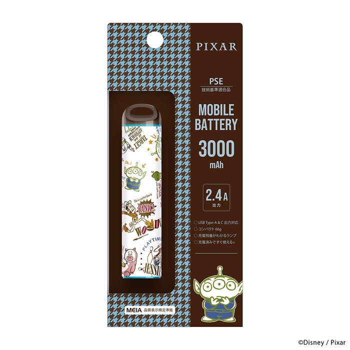 ディズニーキャラクターデザインの軽量コンパクトでポーチにも収まるスティック型モバイルバッテリー 3,000mAhです。USB type-A/Type-Cポートでの出力対応・2台同時充電も可能です。また、スマートフォン本体を充電しながらモバイルバッテリーも充電できるパススルー充電に対応しています。お手持ちのストラップを付けて落下を防止できる便利なストラップホール付き。充電済みですぐ使える(※満充電ではありません。)。PSE適合商品。
