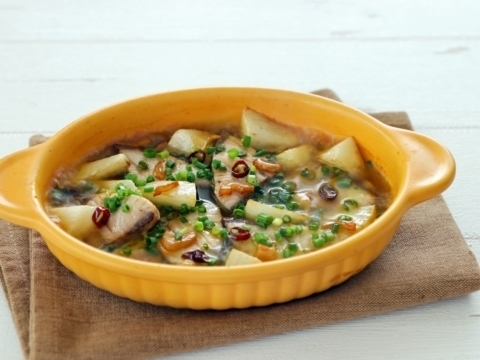 たことじゃがいもを使ったスペインの郷土料理「ガリシア風」をイメージし、千葉県産の食材でアレンジした黒アヒージョです。「鮮度生活 減塩しょうゆ」の軽やかなうま味で、ヘルシーに仕上げました。