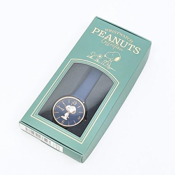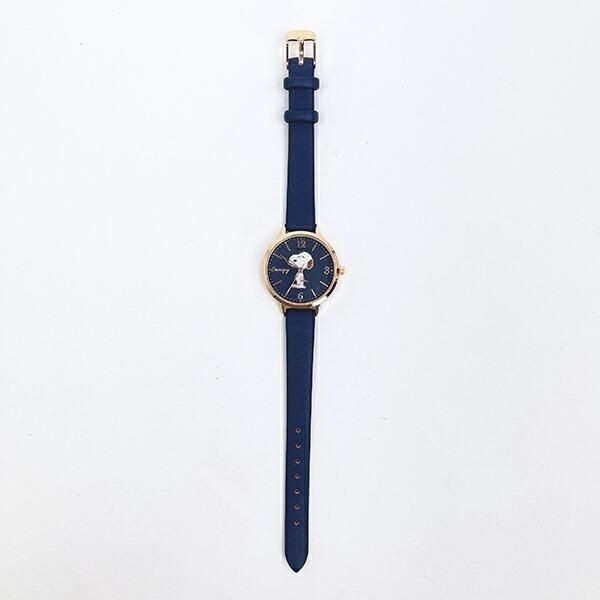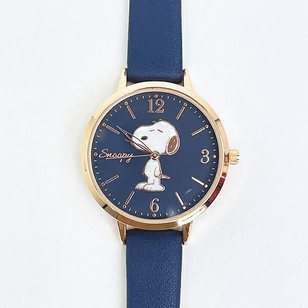 ネイビーの文字盤には、目を閉じた愛らしい表情のスヌーピーがあしらわれています。
