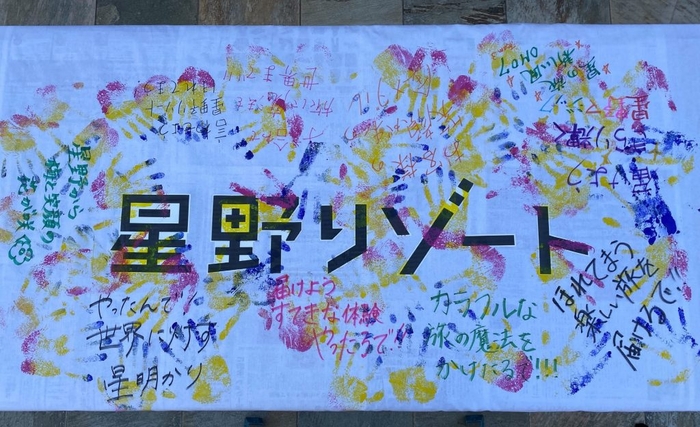 2007年の入社式より恒例となっている「契りの会」では、これから働く決意をこめて新入社員がチーム毎に川柳を読み上げ、手のひらを絵具に浸し、手形を押す手形の契りを交わしました。手形の契りは、社員と会社の間で結ぶ2つの約束を意味しています。1つ目は、当社が社員に対し、法律上の雇用関係だけではなく、時には雇用主と雇用者との関係を超えて社員を助ける、という約束です。2つ目は、社員が研修で学ぶ組織文化に寄与するという約束を意味します。今回の「契りの会」には、代表の星野佳路や、2月7日以降に着任予定である施設の支配人もオンラインで温かく見守りながら進めました。