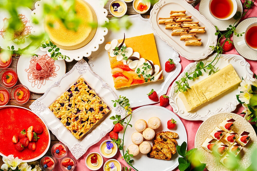 濃厚で甘酸っぱい苺クリームをたっぷり絞った「苺のしぼりたてモンブラン」を始めとする苺スイーツ。花の彩りが春らしいビジュアルの「クリームチーズのプリン」など、チーズを使ったデザートは贅沢に9種類と、チーズスイーツ好きにはたまらないラインナップをご用意しました。その他、「キウイタルト」や「ピスタチオマドレーヌ」などホテルメイドのスイーツがずらり。ピンク・きいろ・みどりとブッフェ台を彩るスイーツたちで春を呼び込みました。