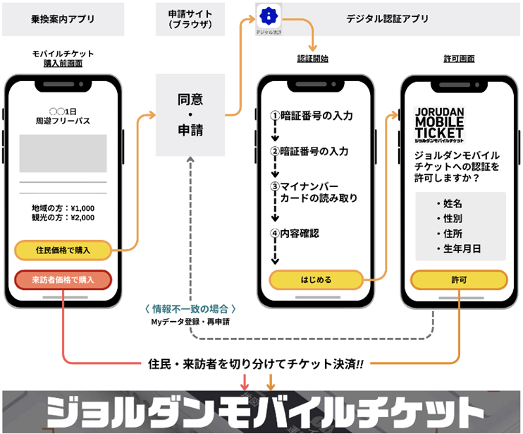 ジョルダンモバイルチケットを購入する際に、本人確認により、ユーザーが登録した「Myデータ」(氏名・住所・生年月日等)の情報との一致を確認し、住民・観光客・子ども・大人・高齢者など利用者の属性区分を確認することが可能となります。これにより、利用者ごとに適切な価格のモバイルチケットを提示する新たな仕組みを開発しました。