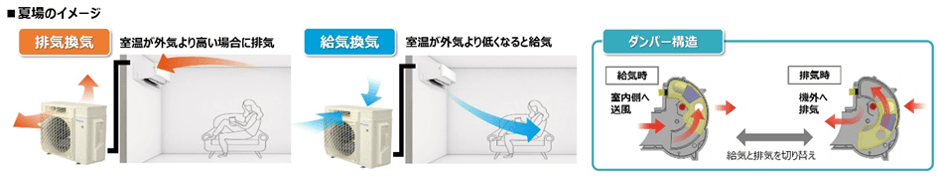 新モデルの本商品は、室外機に新たに搭載した「ダンパー構造」と「高静圧ターボファン」により、給気と排気の換気方式を切り替えることが可能です。排気換気に切り替えることで、室内を換気しながら不快な熱や湿気を屋外に排出できます。