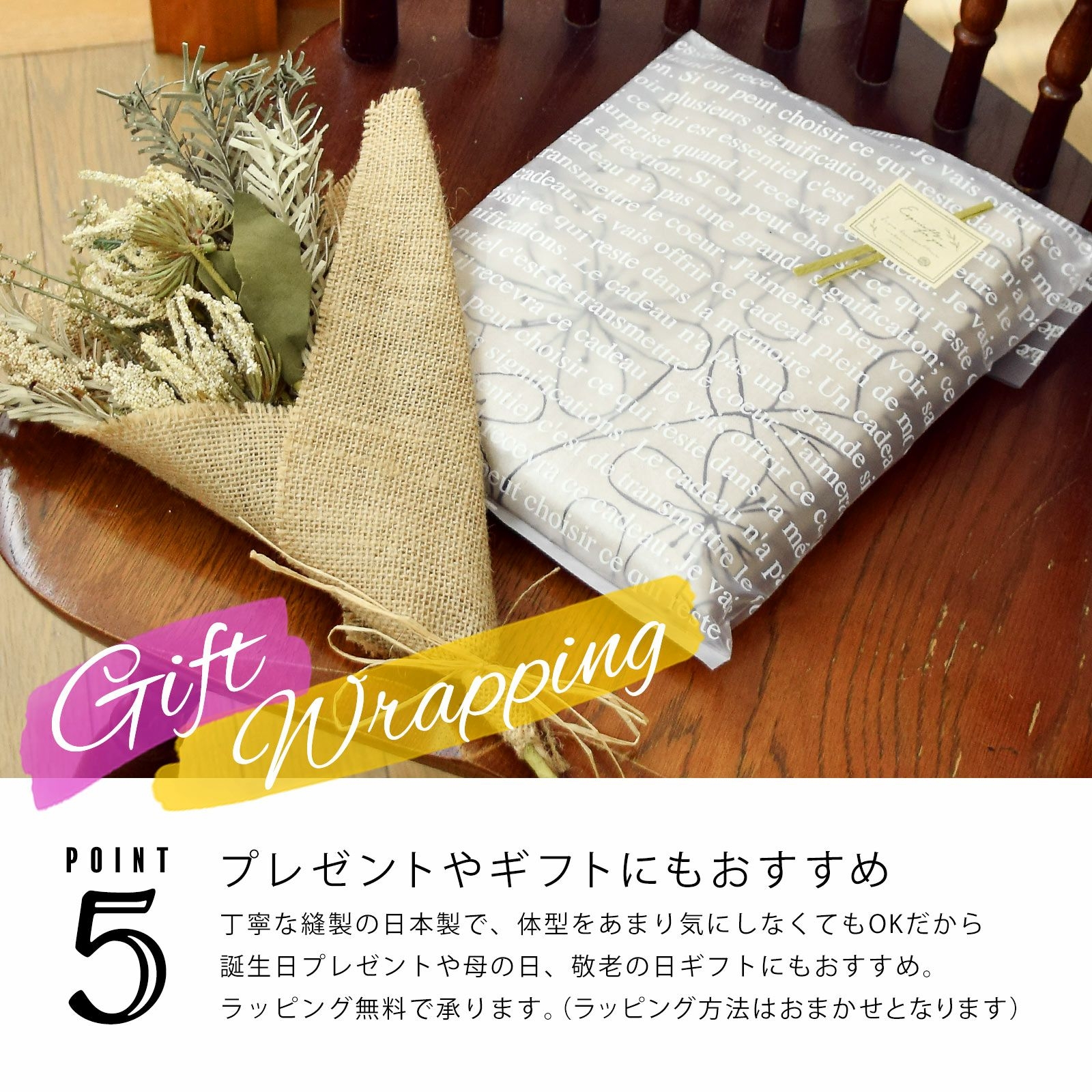 丁寧な縫製の日本製で、体型をあまり気にしなくてもOKだから誕生日プレゼントや母の日、敬老の日ギフトにもおすすめ。ラッピング無料で承ります。(ラッピング方法はおまかせとなります)