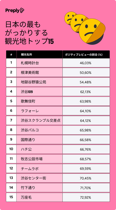 言語学習プラットフォーム「Preply(プレプリー)」は、全国80箇所以上の観光名所について、旅行者の評価を分析した調査結果を発表しました。本調査では、観光地の満足度を「良いレビュー」の割合で数値化し、ランキング形式で整理しています。
