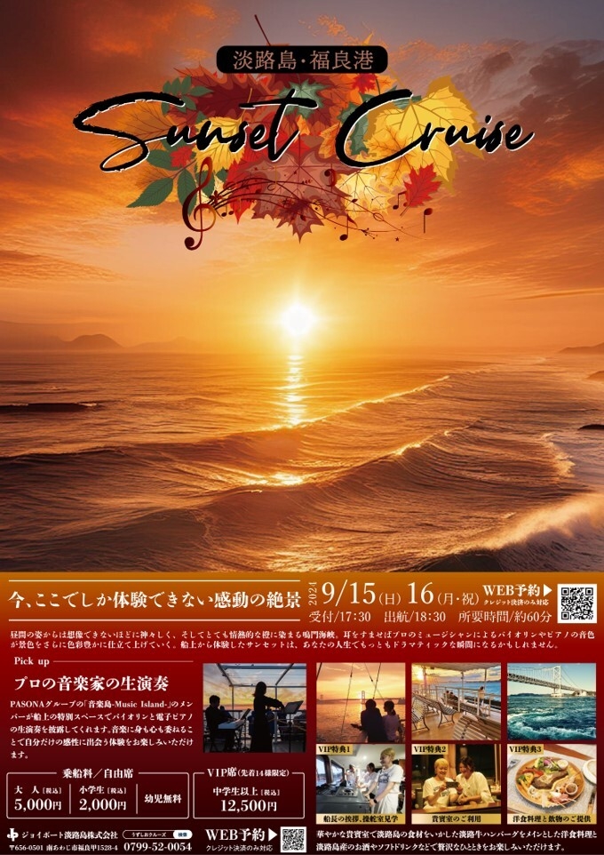 内容 :鳴門海峡で夕日と渦潮、プロの音楽家による生演奏を楽しむクルージング。