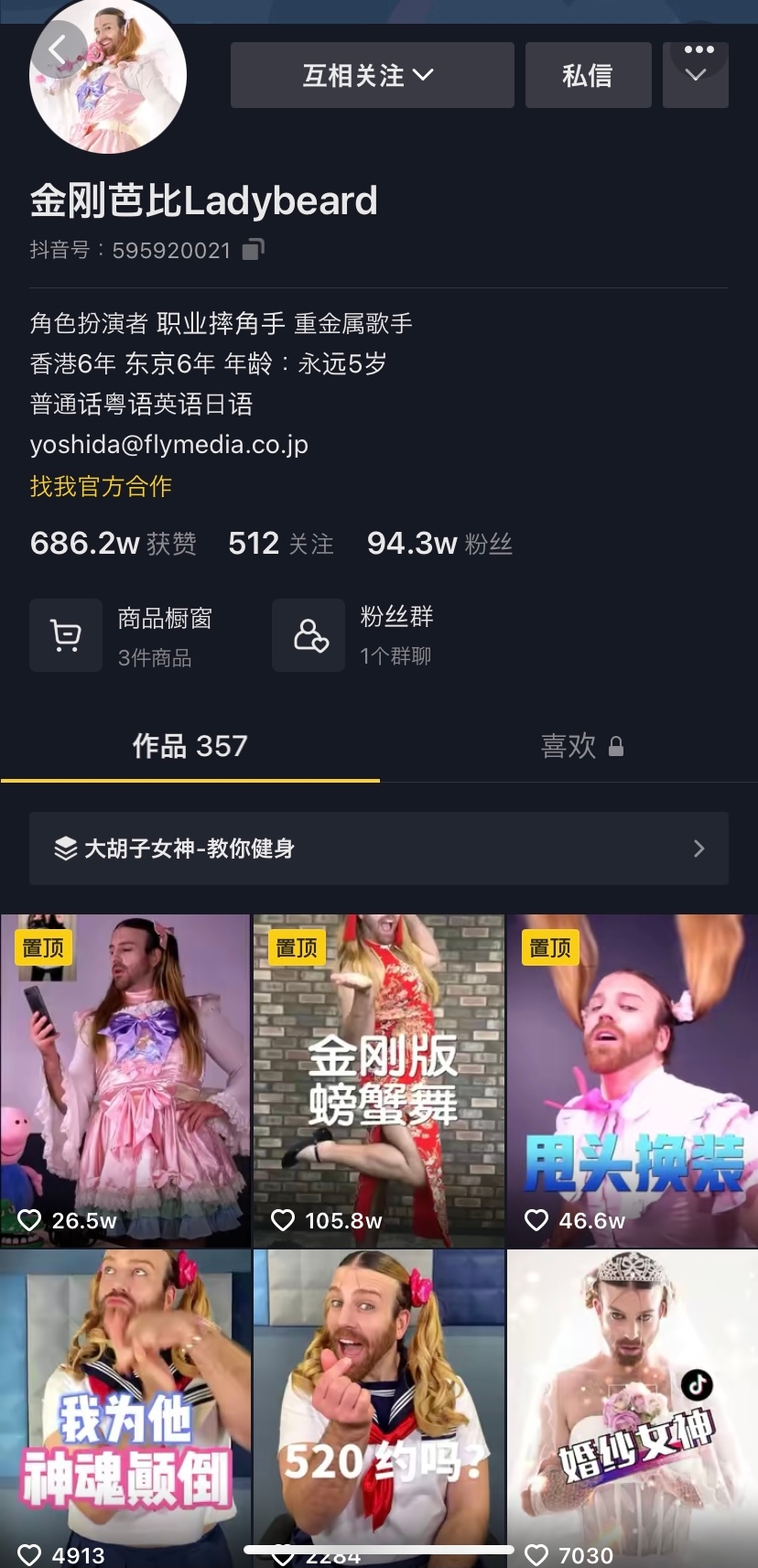 2018年に抖音を開設し、現在のフォロワーは94.3万人にのぼる。