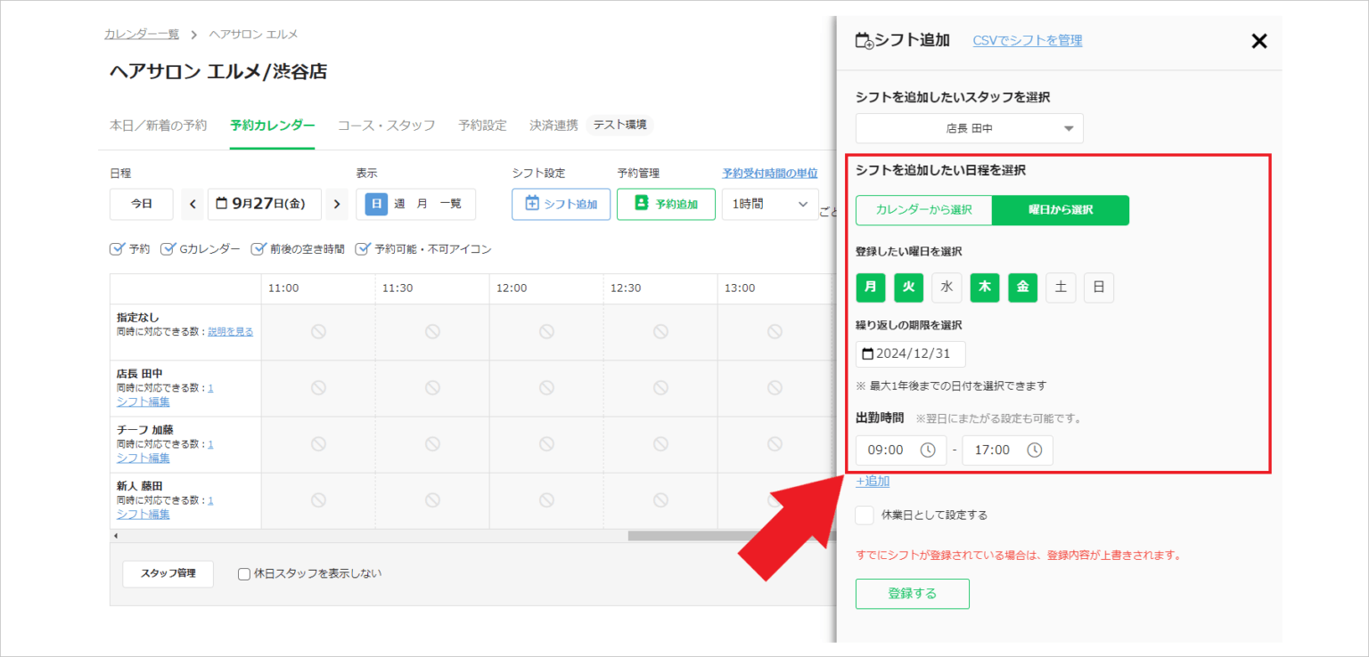 アップデートにより、サロン・面談予約で曜日ごとのシフト登録が可能になりました。
