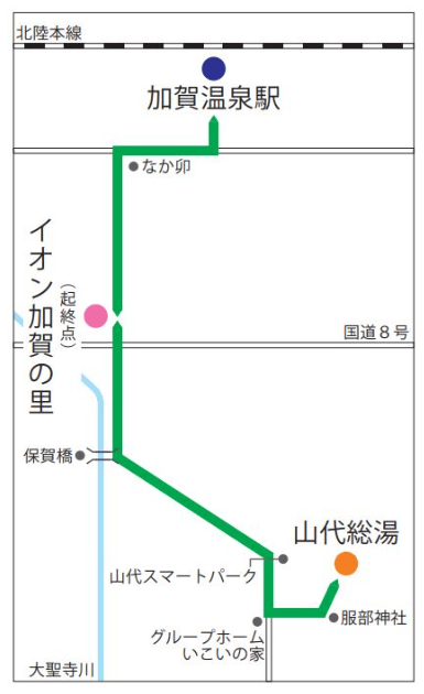 山代温泉総湯(降車のみ)とイオンを往復、イオンと加賀市医療センターを通過して加賀温泉駅ロータリー(降車のみ)を往復するルート